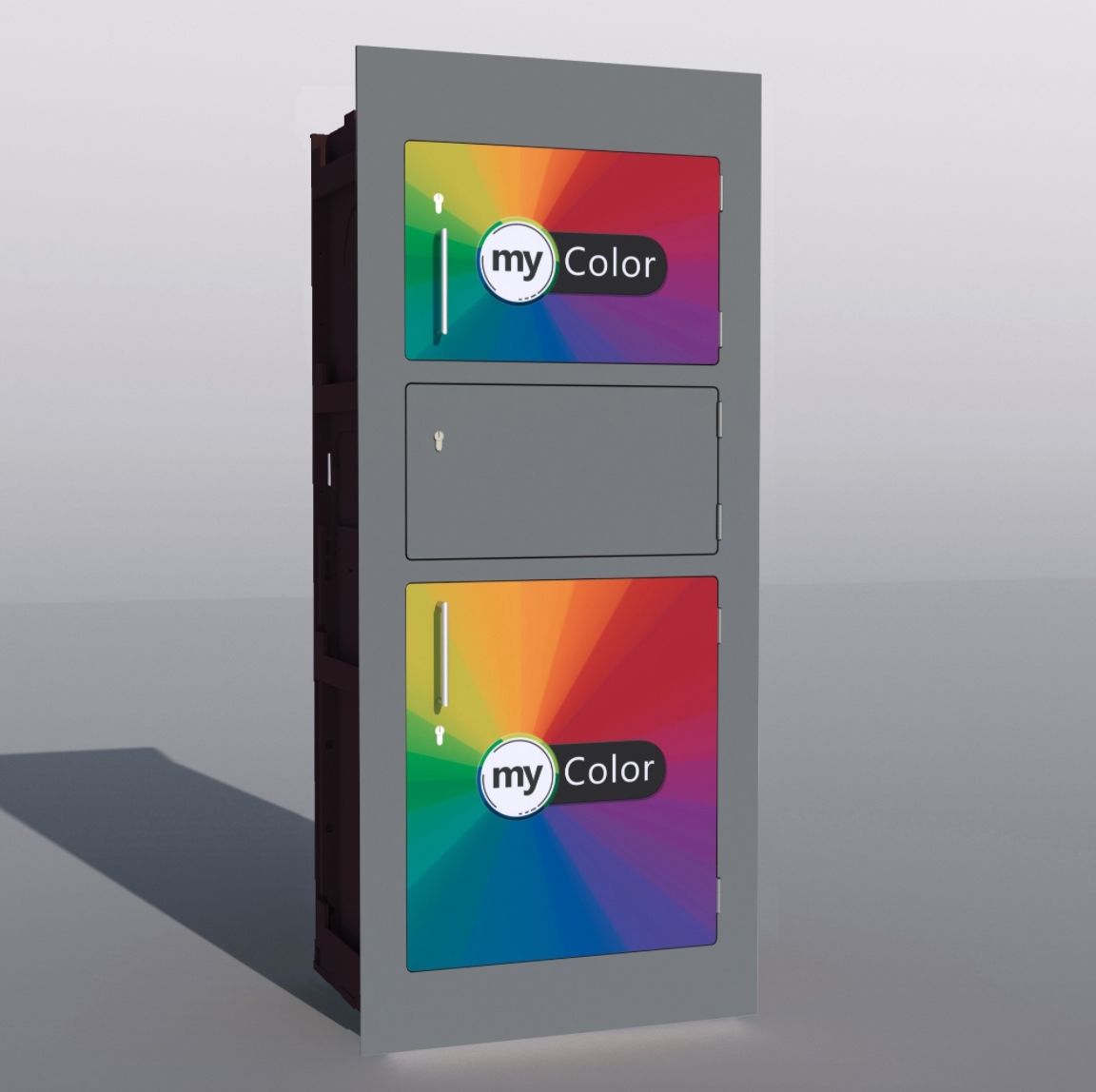 Bei Auswahl mit Hintertür ist die Rückplatte aus Trespa (HPL) und in der selben Farbe wie die Farbe der Frontplatte.
