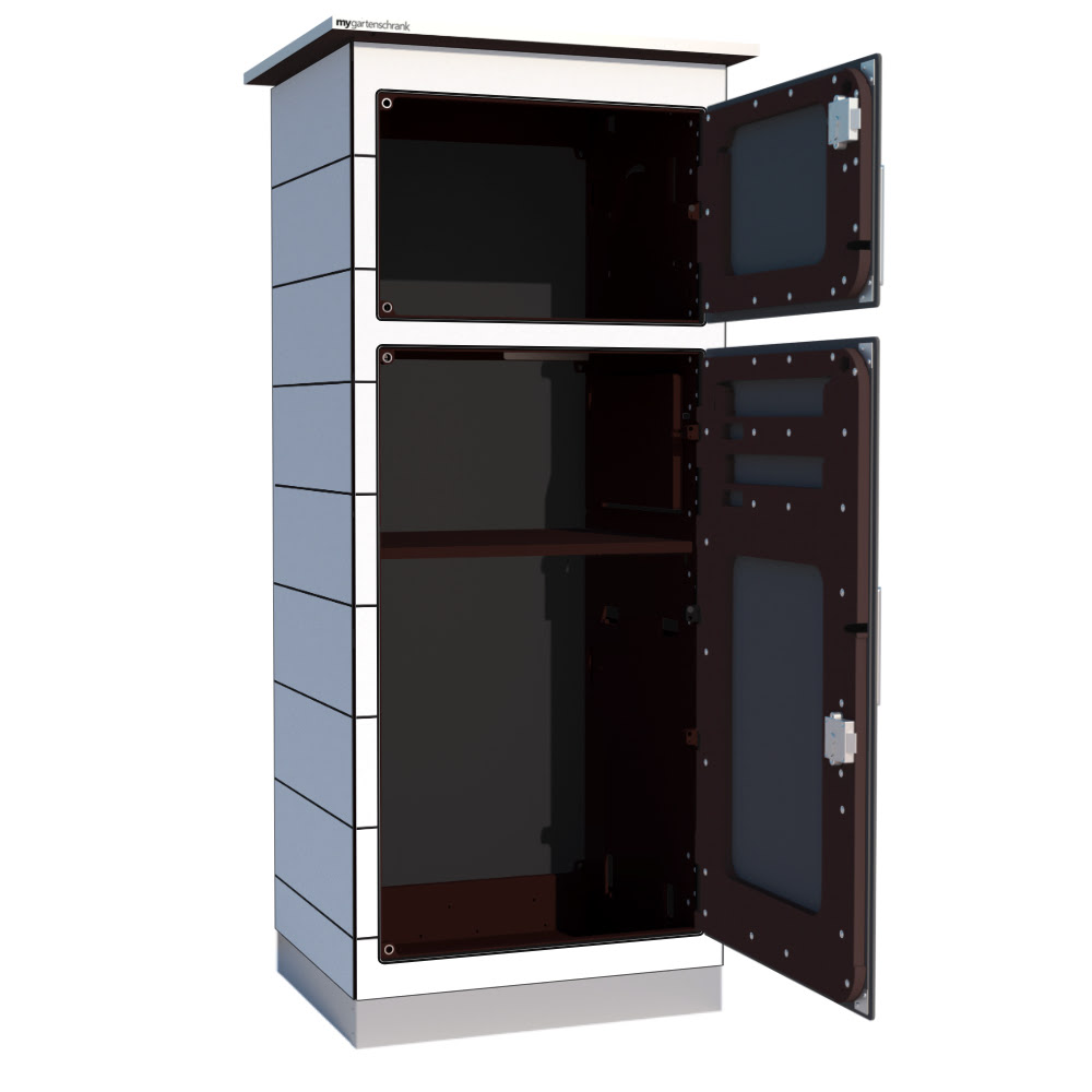 Der Innenaufbau des modernen Outdoor Schranks ist durch die verbauten Siebdruckplatten ebenfalls wetterfest.